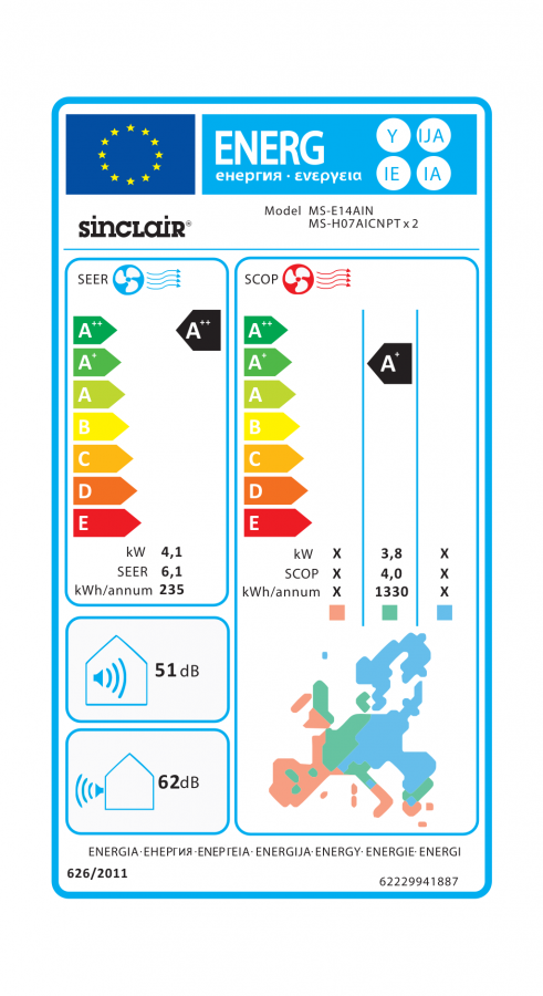 | Klasa efektywności energetycznej w trybie chłodzenia / grzania (umiarkowany) | A++ / A+ |