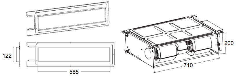 | Wysokość x szerokość dyfuzora ssawnego / tłocznego | 710 x 200 / 585 x 122 mm |