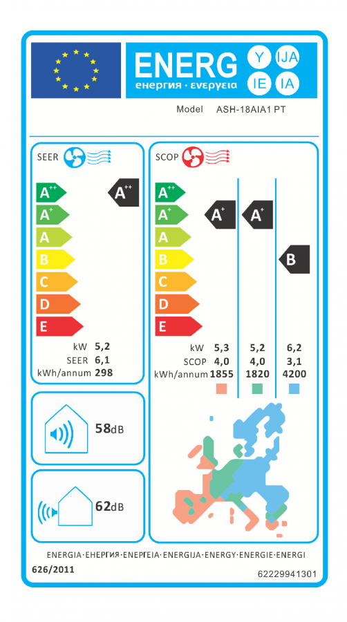 | Klasa efektywności energetycznej w trybie chłodzenia / grzania (umiarkowany) | A++ / A+ |