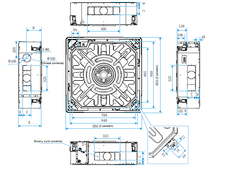 | Długość x wysokość x szerokość jedn. wewn. | 840 x 204 x 840 mm |